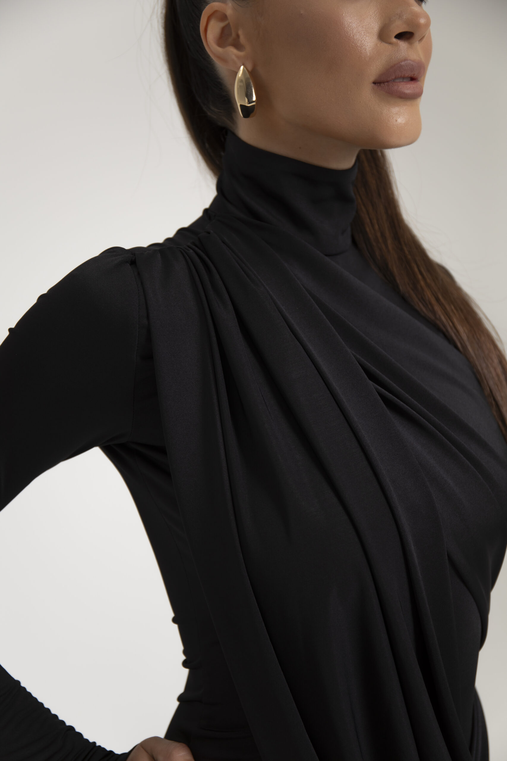 Treten Sie mit unserem Kleid „Enchanted Elegance“ ins Rampenlicht – eine faszinierende Mischung aus Eleganz und Charme. Gefertigt aus luxuriösem, weichem Stoff, besticht dieses Kleid mit einem schicken Stehkragen und einer dramatischen Drapierung, die Ihre Figur perfekt betont. Der asymmetrische Saum verleiht ihm einen modernen Touch und macht es perfekt für jedes gehobene Event oder jeden Abend. Kombinieren Sie es mit auffälligen Accessoires und Ihren Lieblings-High-Heels für einen Look, der Selbstbewusstsein und Anmut ausstrahlt. Werten Sie Ihre Garderobe mit diesem atemberaubenden Stück auf und unterstreichen Sie Ihren weiblichen Charme!