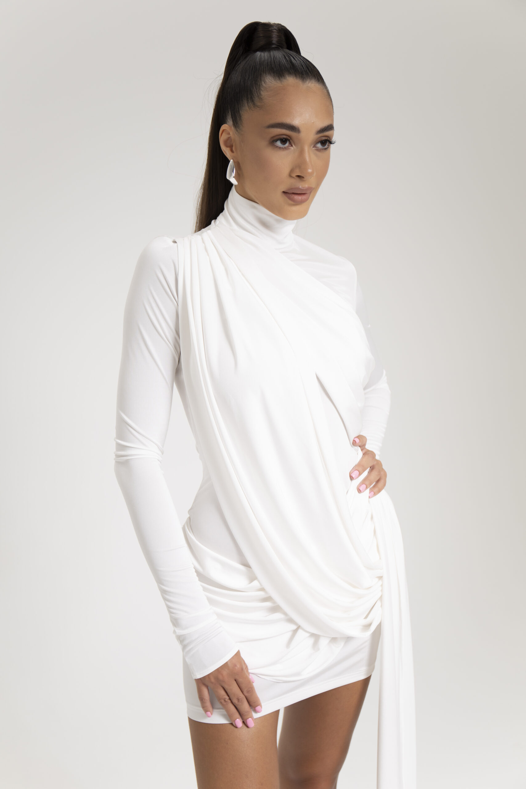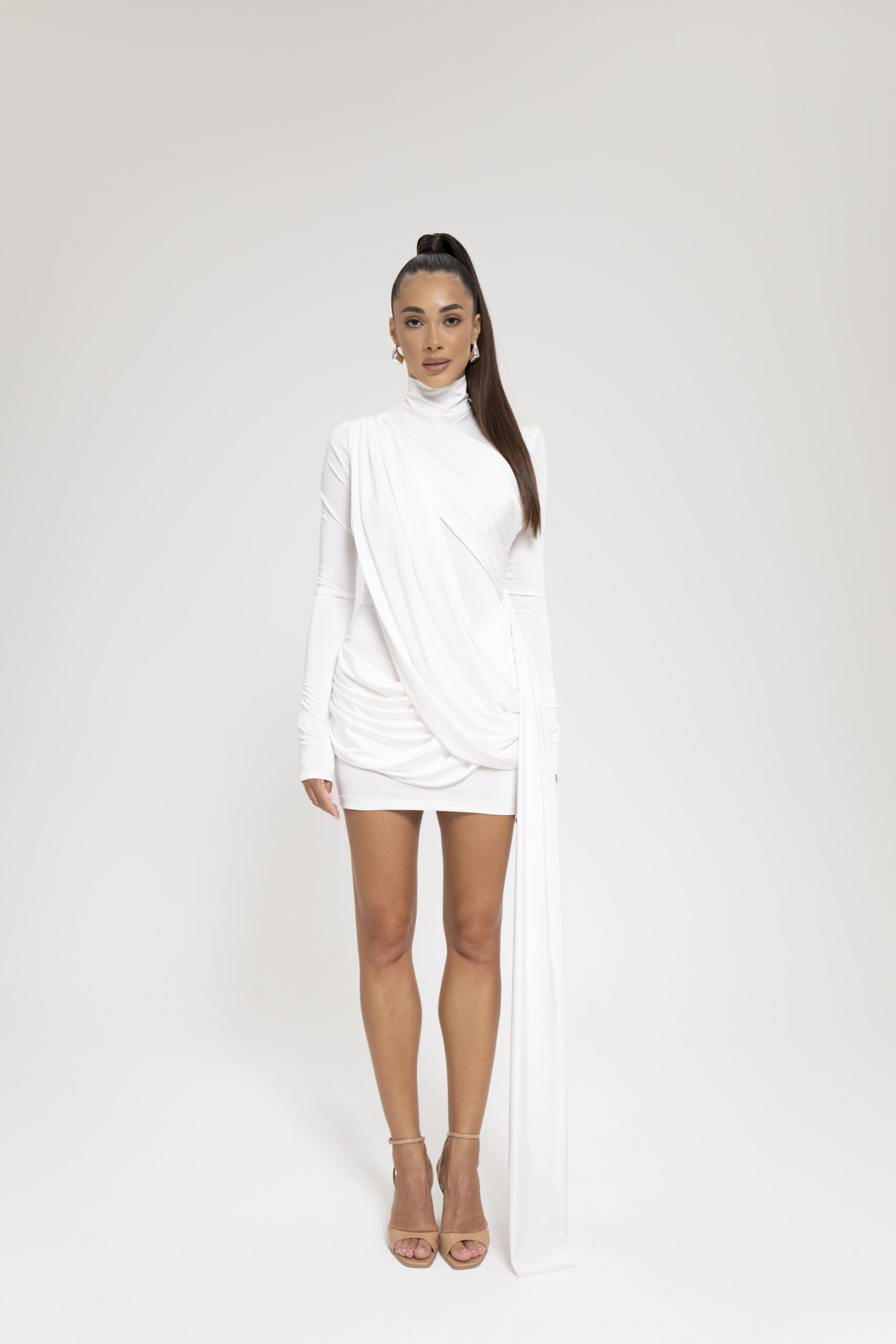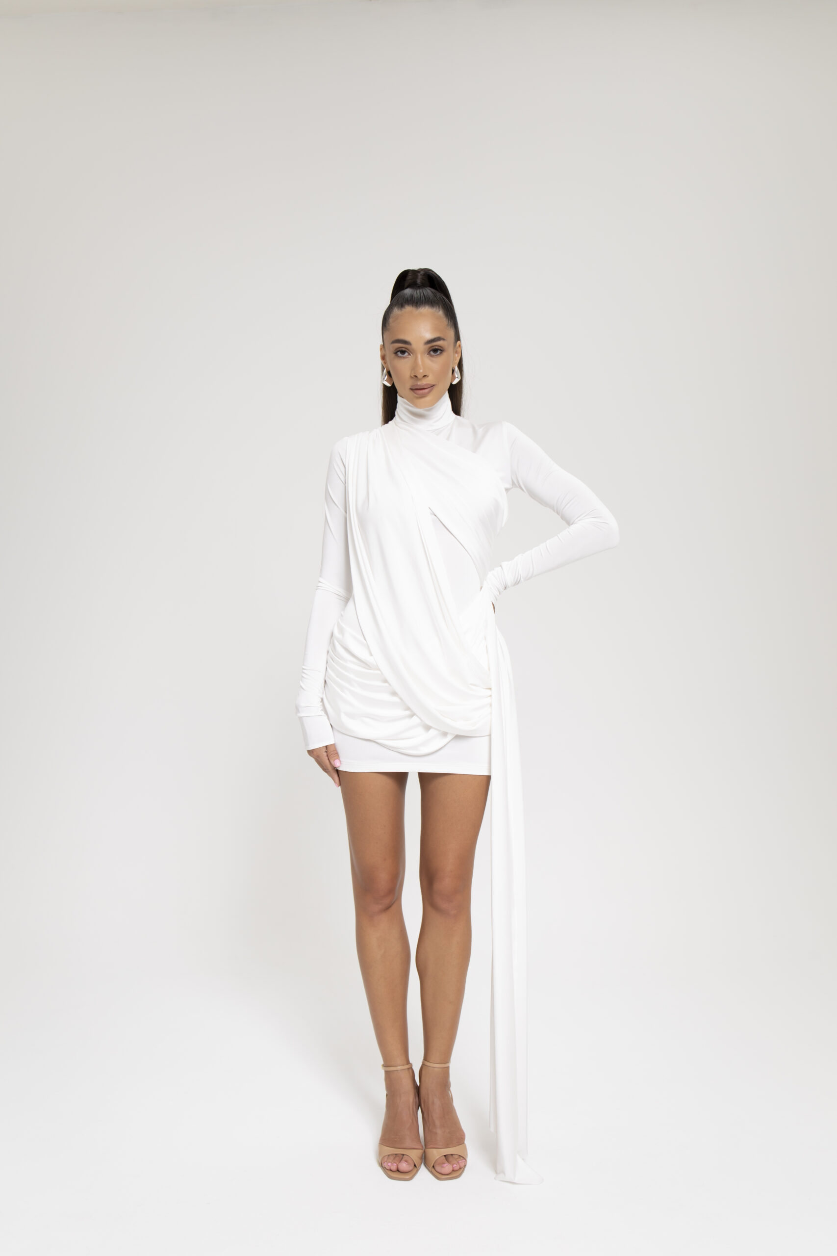 Mettiti al centro dell’attenzione con il nostro abito Enchanted Elegance, un’accattivante combinazione di raffinatezza e fascino. Realizzato in un lussuoso e morbido tessuto, questo abito presenta un elegante collo alto e un drappeggio spettacolare che esalta magnificamente la tua figura. L’orlo asimmetrico aggiunge un tocco moderno, rendendolo perfetto per qualsiasi evento o serata elegante. Abbinalo ad accessori di tendenza e ai tuoi tacchi preferiti per un look che trasuda sicurezza ed eleganza. Esalta il tuo guardaroba con questo splendido capo e scopri il tuo fascino femminile!